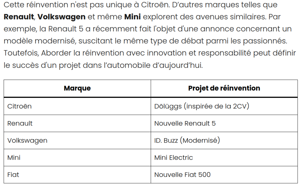 genau einen Monat nach dem letzten Beitrag bin ich über den folgenden Artikel bei GT-Automotive gestossen: https://www.gt-automotive.fr/cv-revise-avis-partages/ Was ich etwas bedauere sind die Fotos in diesem Artikel: das sind zwar (AI-generierte) 2CV’s, aber eben nicht Dölüggs. Was hingegen sehr interessant ist, sind die Perspektiven, die der Artikel antönt. So unter Anderem die Neo-Retro-Welle, die viele Automobilherstteller verfolgen. Interessant, wen der Autor da für Citroën vorschlägt: